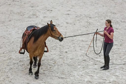 地面訓(xùn)練是每一位馬術(shù)運(yùn)動員都應(yīng)該使用的方法。該方法是加強(qiáng)騎手與其馬的聯(lián)系以及確立自己威信的關(guān)鍵。本篇文章是五個好用而基礎(chǔ)的地面訓(xùn)練第四篇,訓(xùn)練你的馬打圈。 訓(xùn)練你的馬打圈 此訓(xùn)練的目的是讓馬移動他們的馬蹄,但是始終保持在你的四周。訓(xùn)練馬匹圍繞你轉(zhuǎn)一周,該訓(xùn)練也被稱為圈程。你可以使用牽引繩和調(diào)教鞭來完成這項(xiàng)訓(xùn)練。如果沒有任何可供調(diào)教使用的繩索,也可讓馬在調(diào)教圈中進(jìn)行該訓(xùn)練。 這項(xiàng)訓(xùn)練的用途可以是多種:訓(xùn)練你的馬消耗多余的能量;查看馬匹馬蹄是否有問題,是否出現(xiàn)跛瘸等現(xiàn)象;放松僵硬的馬,矯正不良行為;讓騎手/馴馬師在不上馬鞍的情況下,訓(xùn)練馬匹。 本文重點(diǎn)是將馬匹放入圓圈里訓(xùn)練,以矯正馬的不良行為。想象一下,當(dāng)你的馬總是抗議,總是表現(xiàn)不佳,不停地蹦跳、起揚(yáng),與其硬要上馬造成可能的傷害,不如在馬下進(jìn)行相應(yīng)的調(diào)訓(xùn)。 在這種情況下,調(diào)訓(xùn)表現(xiàn)不佳的馬匹,騎手或者馴馬師需要讓馬不停打圈,直到它們不再胡作非為。 據(jù)很多有經(jīng)驗(yàn)的調(diào)教師所講,馬匹最難的步伐是快步,因此要求馬匹快步,除非它們一直要求停下,不然讓它們保持快步。 原理 在野外,如果一匹馬不聽頭馬的命令,頭馬就會讓其他的馬不停追趕這匹不聽話的馬,這也是騎手或者馴馬師需要做的。這個做法可以樹立你的權(quán)威,向它們表明你不喜歡它們現(xiàn)在正在做的事。 其實(shí)很多細(xì)節(jié)可以告訴你,你的這匹馬究竟尊不尊重你。當(dāng)你牽著它們的時候,它們試圖避開你的牽引方向,去吃一邊的草,這就表明了它們的不尊重。這時候,你需要將它們帶到調(diào)教圈里,訓(xùn)練它們。這樣做是在告訴它們,你牽著它們時,并不是它們隨意吃草的時間。 打圈時的馬匹形態(tài) 馬兒也不喜歡總是工作。這個訓(xùn)練會讓它們明白,如果出現(xiàn)不良行為,就意味著更多的工作。當(dāng)你將這種訓(xùn)練帶入到馬匹的日常訓(xùn)練及生活中,你就會知道這對馬的調(diào)教非常有用,可以更快地讓它們學(xué)會尊重和服從。 技術(shù) 首先一只手握住繩索,一只手持調(diào)教鞭。停頓時,讓馬從你身邊經(jīng)過。你需要向馬的后端邁出一步,然后用調(diào)教鞭催促它們。記住,不要真的將鞭子打在馬身上,因?yàn)檫@會讓它們心生膽怯而且會變得不信任你。 當(dāng)馬進(jìn)入調(diào)教圈后,將手中的繩索放出一部分,給它們一些自由度,但是不要讓繩子長到拖地,這樣繩索有可能絆倒馬匹,產(chǎn)生不必要的驚慌和錯誤。 想正確地指引馬,騎手/馴馬師需要了解自己的位置,為了讓馬在圓圈中沿正確的方向向前,保持騎手/馴馬師的身體一直對準(zhǔn)馬的正中,調(diào)教鞭一直指向馬的臀部。 剛開始調(diào)訓(xùn)的時候,馬兒可能會感到困惑,試圖向你靠近或者停下來。這個時候你要做的就是讓它們保持向前,不要停。如果你允許馬靠近你或者停下來,它們有可能養(yǎng)成壞習(xí)慣。 一旦馬匹適應(yīng)了打圈,就可以讓它們進(jìn)行步伐變換。用語言讓它們變換,這里注意,馬兒不太可能馬上對命令做出反應(yīng)。 為了讓馬從慢步變?yōu)榭觳?,首先要語言上說出需要讓它們變換的步伐:“快步!”如果他們沒有反應(yīng),用鞭子催促它們。一旦它們做出反應(yīng),放下鞭子。 訓(xùn)練馬匹停止,說“whoa(歐拉)”,如果它們沒有反應(yīng),可以拉動繩子。一旦它們放慢速度,請釋放壓力。 一旦你教會了馬匹圈程,那么你就有一種新的訓(xùn)練方法來矯正馬匹的不良行為了。這個方法能有效地讓馬匹重新關(guān)注你,等待你的指令。 一段時間的訓(xùn)練后,馬匹可以不費(fèi)力地進(jìn)行步伐變換。因?yàn)轳R的注意力一般僅能保持幾分鐘,因此在圈程中,不斷變換步伐能夠讓它們保持專注,且不會太無聊。不斷變換的步伐也可以將它們分散的注意力拉回來,重新回到騎手或馴馬師身上。 |