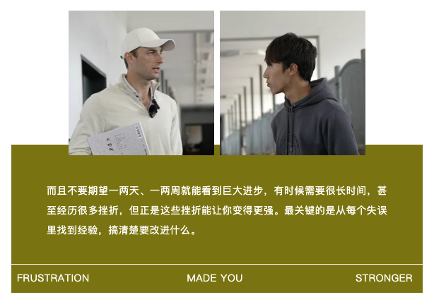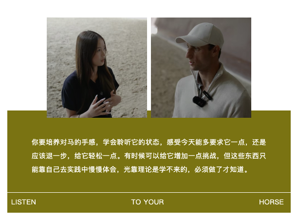 Richard Vogal 2025年仲夏,亞琛世界馬術(shù)節(jié)剛剛謝幕。賽場(chǎng)的光芒散去,草地上的障礙架被逐一搬走,觀眾的歡呼與掌聲漸漸歸于寂靜。但在這份靜默背后,真正的馬術(shù)故事仍在繼續(xù)。 中國(guó)年輕騎手尤彥賀、李涵曦隨馬術(shù)雜志、馬術(shù)在線團(tuán)隊(duì)一同走進(jìn)了勞力士代言人德國(guó)騎手理查德·沃格爾(Richard Vogal)的馬房。 在德國(guó)法蘭克福的郊外,這里遠(yuǎn)離喧囂,卻能看見(jiàn)另一種屬于冠軍的節(jié)奏——對(duì)馬匹的溫柔注視,對(duì)訓(xùn)練的執(zhí)著堅(jiān)持,以及對(duì)團(tuán)隊(duì)的深厚信賴。 勞力士代言人理查德·沃格爾 在2025亞琛賽場(chǎng) ?何亦紅 「ONE」 年輕騎手/騎有經(jīng)驗(yàn)的馬還是年輕馬 Do you recommend us starting off riding experienced horses or just like trying a variety and doing young horses? (2025.07) Pfungstadt Richard Vgal Stable 采訪團(tuán)隊(duì)走向室外訓(xùn)練場(chǎng) ?何亦紅 理查德·沃格爾的馬房位于黑森州Pfungstadt(普芬施塔特),是他與他的團(tuán)隊(duì)的日常訓(xùn)練場(chǎng),并承擔(dān)著年輕馬的日常調(diào)教與公開(kāi)展示功能。 馬術(shù)雜志團(tuán)隊(duì)到達(dá)的時(shí)候,理查德正在訓(xùn)練場(chǎng)上騎乘一匹氣質(zhì)穩(wěn)重的栗色馬——Sven,他給我們解釋了這匹馬名字的由來(lái)頗為可愛(ài):“在動(dòng)畫(huà)片《冰雪奇緣》里有只馴鹿叫Sven,女孩們看它長(zhǎng)得像,就給它取了這個(gè)名字。” 理查德解釋,真正能在賽場(chǎng)上脫穎而出的馬,往往要聰明、敏銳、反應(yīng)快,能迅速察覺(jué)變化:“有些馬你騎著,轉(zhuǎn)圈轉(zhuǎn)個(gè)十分鐘它才意識(shí)到‘哦,有人啊’,這種馬通常反應(yīng)也慢,比賽中附加賽拼速度的時(shí)候,這種馬就不是最快的。 我們需要那種敏銳的馬,能立刻注意到環(huán)境變化?!钡斆鞯鸟R也常常膽子小,需要時(shí)間去適應(yīng),“每匹馬有自己的時(shí)間表,有的天賦異稟、進(jìn)步神速,有的‘開(kāi)竅晚’,但反而更值得期待。給它們時(shí)間,慢慢讓它們適應(yīng)更大的賽場(chǎng),激發(fā)出真正的潛力,那就是我們的工作?!?/span> 理查德的馬房以高水平競(jìng)賽+年輕馬培養(yǎng)/交易+種馬展示與育種合作為主,體現(xiàn)著“競(jìng)技—育種—商業(yè)”一體化的運(yùn)營(yíng)路徑。 在訓(xùn)練場(chǎng)邊,中國(guó)青少年騎手李涵曦詢問(wèn)理查德·沃格爾的建議:“像我們這樣的年輕騎手,應(yīng)該選擇經(jīng)驗(yàn)豐富的馬,還是多去嘗試不同類型的,包括一些年輕馬?” 理查德的回答并沒(méi)有一刀切的絕對(duì),而是緩緩道來(lái)一段經(jīng)驗(yàn)之談:“我覺(jué)得多樣化是非常好的。當(dāng)然,經(jīng)驗(yàn)豐富的馬更容易學(xué),也更容易跟上節(jié)奏。 而且當(dāng)你犯錯(cuò)的時(shí)候,它們通常能幫你彌補(bǔ)。但是騎年輕馬我認(rèn)為也非常重要,因?yàn)槟隳茉谶^(guò)程中培養(yǎng)出對(duì)馬更敏銳的感覺(jué)。” “我的經(jīng)驗(yàn)是,訓(xùn)練得好的馬狀態(tài)比較穩(wěn)定,不會(huì)每天差別太大。而年輕馬,你知道,它們有時(shí)候狀態(tài)特別好,有時(shí)候可能就不太行。這時(shí)候你就得學(xué)會(huì)去感受你的馬,今天它能做到什么,能要求它做多少。你也能從它們身上看到進(jìn)步,通常比老馬快。 像十二三歲的馬,基本上提升空間就有限了,更多是保持它的狀態(tài)和快樂(lè),而不是繼續(xù)去突破。而四五六歲的馬,它們還在成長(zhǎng)階段,你可以和它一起成長(zhǎng)、一起變得更好。所以我覺(jué)得對(duì)年輕騎手來(lái)說(shuō),騎不同類型的馬、包括年輕馬,是很重要的。” 「TWO」 良好的騎坐/是重要的基礎(chǔ) when you have a very correct position,it's easier to communicatewith your horse. 理查德·沃格爾 對(duì)馬房工作親力親為 談及對(duì)中國(guó)年輕騎手的建議,他的神情認(rèn)真了許多:“他們都很有抱負(fù),這是好事。我小時(shí)候也非??释麑W(xué)習(xí),想看到偶像們現(xiàn)場(chǎng)比賽,但機(jī)會(huì)有限,所以只能一遍遍看比賽視頻,看他們?yōu)槭裁幢任液?,然后回到馬房繼續(xù)練習(xí),反復(fù)調(diào)整自己的騎坐。 騎坐非常重要,它是你和馬交流的語(yǔ)言。姿勢(shì)正確了,不論哪匹馬都能理解你。” “另外,如果比賽出了問(wèn)題,當(dāng)然你會(huì)沮喪,但最重要的是從失誤里學(xué)習(xí)。一定要有人幫你錄像,這樣你能回頭看看哪里出了問(wèn)題,為什么會(huì)出問(wèn)題,然后和教練一起討論、改進(jìn),再去訓(xùn)練,等準(zhǔn)備好了再去比賽。 「THREE」 沒(méi)有熱愛(ài)/無(wú)法在這個(gè)行業(yè)堅(jiān)持下去 It's all about passion and you have to wonder it and that's the reason that makes the sense. (2025) Richard Vogal In Aachen 勞力士代言人理查德·沃格爾 在2025亞琛賽場(chǎng) ?何亦紅 理查德·沃格爾的日常訓(xùn)練強(qiáng)度大到驚人——常常一天騎10到14匹馬,最多時(shí)曾達(dá)17匹。能讓這一切高效運(yùn)轉(zhuǎn)的,是背后聯(lián)系緊密的團(tuán)隊(duì)。 比賽時(shí),主力馬工Felicia Wallin陪伴左右,見(jiàn)證了他職業(yè)生涯的幾乎所有“第一次”;在家里,另一支后勤隊(duì)伍悉心照料五十余匹馬,從打圈、森林騎行到障礙訓(xùn)練,不讓任何一匹馬因他外