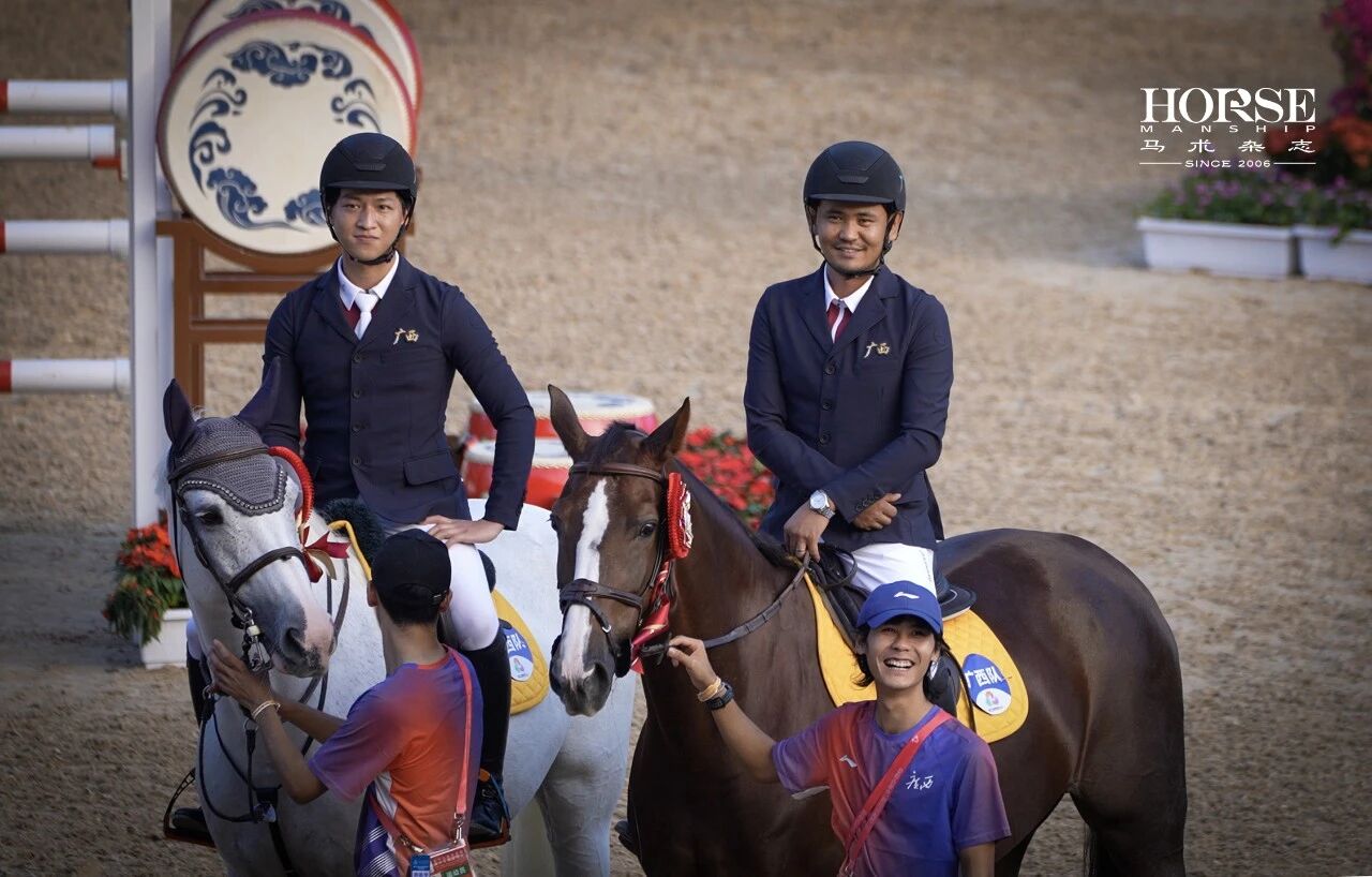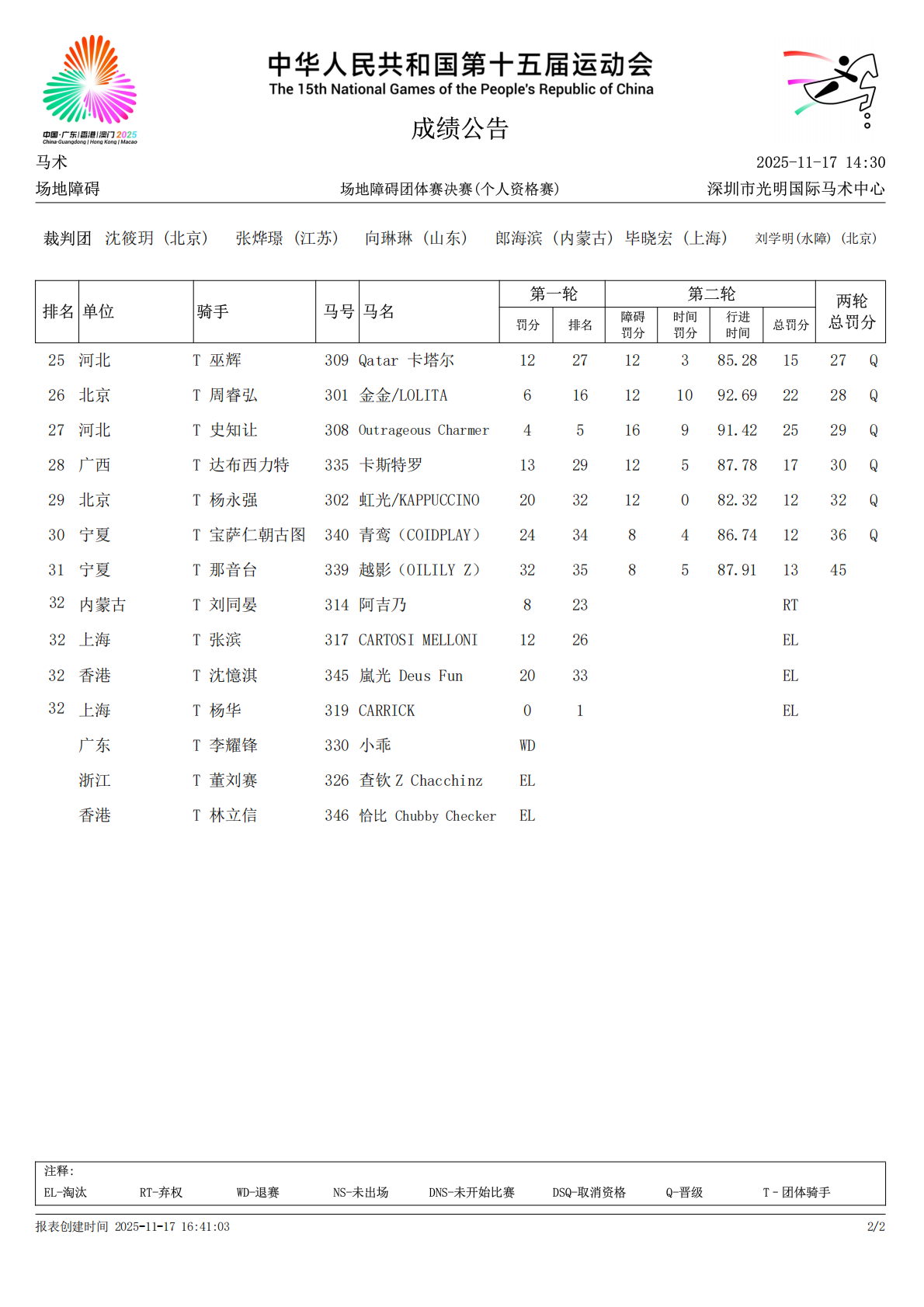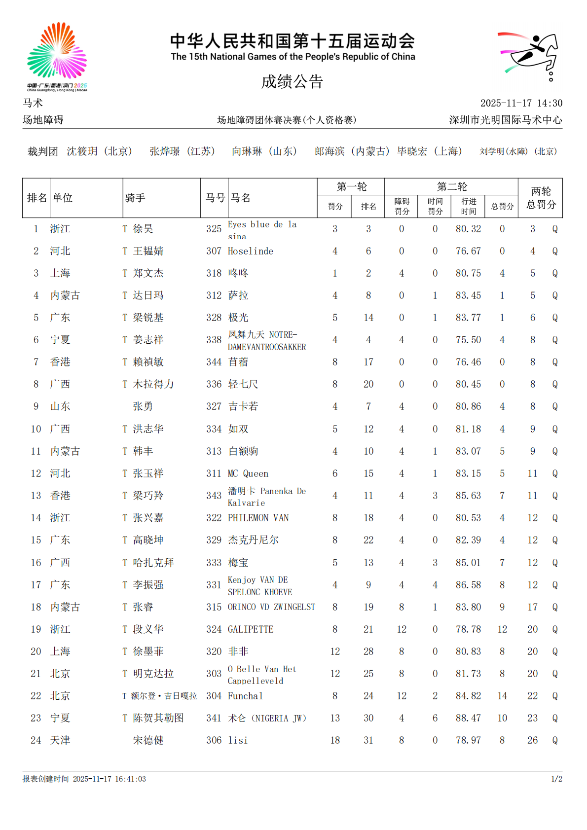 11月17日,中華人民共和國第十五屆運(yùn)動會馬術(shù)場地障礙團(tuán)體賽暨個人資格賽在深圳光明國際馬術(shù)中心順利舉行,書寫了一場充滿變數(shù)的賽場故事。 從第一輪上海隊(duì)13罰分領(lǐng)跑展現(xiàn)的精準(zhǔn)操控,到第二輪廣西隊(duì)以29分總罰分逆襲登頂?shù)姆€(wěn)健發(fā)揮,九支隊(duì)伍在障礙間的每一次起跳、每一次落地,都既藏著人馬協(xié)作的默契,也帶著競技體育的未知。 這場賽事不僅誕生了新的冠軍,也讓觀眾看到了不同隊(duì)伍在挑戰(zhàn)面前的堅(jiān)守與突破。 第一輪:上海隊(duì)驚艷領(lǐng)跑,傳統(tǒng)強(qiáng)隊(duì)暫居中游 團(tuán)體賽成績計(jì)取每輪最佳3對人馬組合總罰分,兩輪累計(jì)罰分低者勝出。 上海隊(duì)以 13 分的超低罰分驚艷全場,強(qiáng)勢占據(jù)榜首位置。騎手楊華搭檔馬匹 “CARRICK” 以完美表現(xiàn)拿下全場唯一的零罰分,同隊(duì)騎手鄭文杰搭檔馬匹“咚咚”僅因速度稍慢獲得了1分時(shí)間罰分。 緊隨其后的是河北隊(duì),人均僅打落一桿,得到14分的罰分,暫列次席。排名第三的內(nèi)蒙古隊(duì)則穩(wěn)扎穩(wěn)打,首輪先獲得16罰分。 內(nèi)蒙隊(duì)騎手張睿搭檔“ORINCO VD ZWINGELST” 圖/何亦紅 最終的冠亞軍在首輪并未展現(xiàn)出絕對優(yōu)勢,廣東隊(duì)以17罰分暫列第四,廣西隊(duì)18罰分排名第五。 第二輪:廣西隊(duì)逆襲,上海隊(duì)遺憾止步 廣西隊(duì)在第二輪強(qiáng)勢反擊:木拉得力與“輕七尺”率先交出零罰分,兩名隊(duì)友雖各落一桿,但全隊(duì)仍以 11 分的單輪罰分(總罰分 29)實(shí)現(xiàn)大逆轉(zhuǎn),從首輪第五一路沖到冠軍位置。 這枚金牌,是廣西馬術(shù)隊(duì)參加全運(yùn)會以來的第一枚金牌,也為他們寫下了真正意義上的歷史時(shí)刻。 “上屆全運(yùn)會我也代表廣西隊(duì)出戰(zhàn),但因1分時(shí)間罰分,隊(duì)伍遺憾無緣前三。這一屆非常非常幸運(yùn),能夠與三位首次來到全運(yùn)會賽場的隊(duì)友一起贏得金牌,創(chuàng)造屬于我們的歷史?!辟惡蠼邮荞R術(shù)在線記者采訪時(shí),廣西隊(duì)騎手木拉得力激動地說道。 廣西隊(duì)騎手木拉得力搭檔馬匹 “輕七尺” 圖/何亦紅 廣西隊(duì)騎手洪志華(左)哈扎克拜(右) 圖/何亦紅 作為全運(yùn)會上的常年勁旅,廣東隊(duì)本輪依舊發(fā)揮穩(wěn)健。梁銳基搭檔“極光“輕盈完賽,獲得1分時(shí)間罰分,全隊(duì)總罰分30,僅以1分之差惜獲亞軍。 廣東隊(duì)騎手梁銳基搭檔馬匹“極光“ 圖/何亦紅 廣東隊(duì)騎手李振強(qiáng)搭檔馬匹“Kenjoy VAN DE SPELONC KHOEVE” 圖/何亦紅 內(nèi)蒙古隊(duì)緊隨其后,全隊(duì)最后登場的騎手達(dá)日瑪搭檔“薩拉”頂住壓力,只因速度稍慢獲得1分時(shí)間罰分。最終隊(duì)伍成功保持住了第一輪的排名,以31分總罰分收獲季軍。 內(nèi)蒙古隊(duì)騎手們進(jìn)行勝利騎乘 圖/何亦紅 內(nèi)蒙古隊(duì)騎手達(dá)日瑪搭檔“薩拉” 圖/何亦紅 而首輪領(lǐng)跑的上海隊(duì),在第二輪遭遇了意外挑戰(zhàn):在僅有三對人馬組合參賽的情況下,首輪唯一一位零罰騎手楊華的搭檔馬匹“CARRICK“在場上兩次不服從,根據(jù)規(guī)則被判罰淘汰,最終隊(duì)伍因有效成績不足三人,未能計(jì)入總排名。 在個人資格賽中排名前30的人馬組合晉級決賽,將于11月19日展開對決,晉級名單如下。 十五運(yùn)馬術(shù)項(xiàng)目的壓軸之戰(zhàn)即將登場,場地障礙個人決賽的勝負(fù)往往在瞬息之間定奪。賽事看點(diǎn),不容錯過!關(guān)注馬術(shù)在線公眾號,第一時(shí)間獲得戰(zhàn)報(bào)速遞! 文/劉桐溪 圖/何亦紅 |