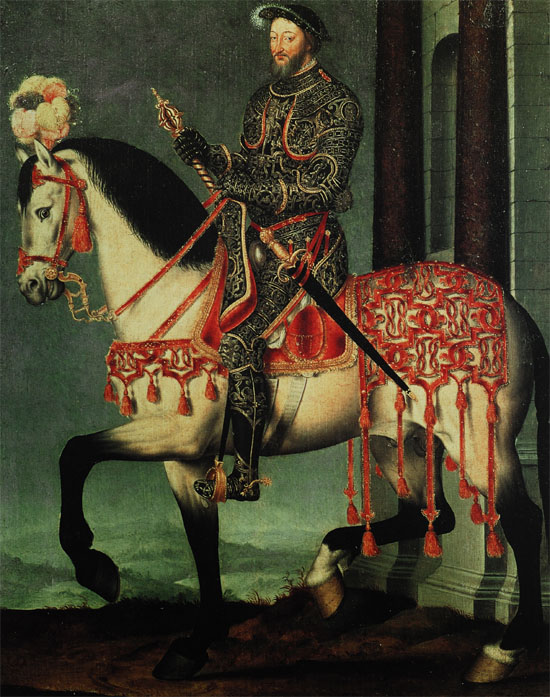 法國弗朗索瓦一世騎馬圖【1540年左右】 布面油畫,27×22 cm;佛羅倫薩,烏菲茲美術(shù)館 這幅法國弗朗索瓦一世騎著一匹雄赳赳的棕黃色駿馬的畫像,讓人毫不懷疑這位統(tǒng)治者的偉大與威嚴(yán)。細(xì)致描畫的駿馬配套裝備,以及國王身著的盔甲,都為這幅華麗的畫像增色不少。這匹馬非??∶溃粌H健壯而且平衡感極佳,皮毛光澤閃亮,就像一匹真正的駿馬。這幅圖中的馬,是在這一時(shí)期歐洲騎馬圖中并不常見的棕黃色馬,因此它必定是一匹非常珍貴的駿馬。 早在羅馬帝國之前,諾曼底地區(qū)就已經(jīng)成為法國境內(nèi)一等駿馬的最佳培育地。然而在18世紀(jì)里鵬養(yǎng)馬場(chǎng)開設(shè)之前,當(dāng)?shù)氐鸟R匹培育并未得到官方的統(tǒng)一組織。諾曼底地區(qū)主要以盛產(chǎn)高大、敏捷、精力充沛又極其俊美的戰(zhàn)馬而聞名。這種馬屬于冷血馬,與克盧埃筆下引人注目的棕黃色駿馬截然不同。 |