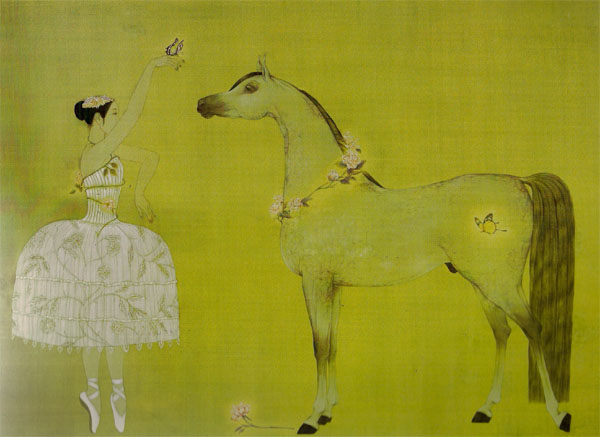 在我看來(lái),純血馬外型硬朗,骨骼精健,馳騁奔跑非它莫屬,強(qiáng)大的讓人畏懼。溫血馬優(yōu)美柔和,內(nèi)在堅(jiān)韌,體量大過(guò)了人的親近。阿拉伯馬卻不大不小剛剛好,又加之其頑皮好動(dòng)的性情,一見(jiàn)之下就很是讓人喜愛(ài)。 阿拉伯馬是可愛(ài)的“寵物”馬。它奔跑時(shí)上揚(yáng)的尾巴和塌鼻梁的特點(diǎn)總能深深吸引著我們駐足觀看。我就曾在它翹尾奔跑時(shí),仿佛看到了神性精靈的躍動(dòng),不禁讓人浮想聯(lián)翩,想到火焰似的沙漠。然而,它也有“靜”的一面,完美的能讓時(shí)間停止。 我在美國(guó)馬都列克星敦的純血阿拉伯馬展上看到的經(jīng)典馬造型是:馬靜止不動(dòng)地注視著馴馬師鞭稍的動(dòng)作。那時(shí),人也會(huì)屏氣寧神于阿拉伯馬此時(shí)散發(fā)出的華貴氣質(zhì)。那一刻,我仔細(xì)探究著這種美,想抓住這種美的輪廓,竟—下子就想到了芭蕾優(yōu)美的立姿。也只有芭蕾有如此氣質(zhì),它們都能讓人的精神暫時(shí)游離凡界。于是,在那刻阿拉伯馬成了芭蕾,芭蕾成了阿拉伯馬,它們?cè)谕ǜ械臉蛄荷瞎餐窨坛龀摲矇m之美。 文、繪畫(huà)/菱子 |