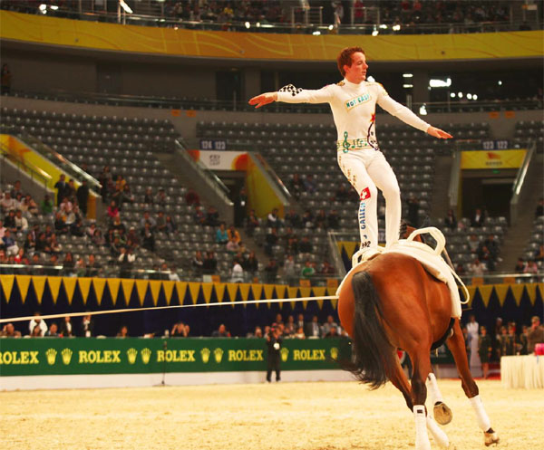 我希望中國(guó)的騎手都有美好的未來(lái),真心祝福FEI 世界杯中國(guó)聯(lián)賽越辦越好!感謝你們給我此次在中國(guó)展示馬背體操這項(xiàng)運(yùn)動(dòng)的機(jī)會(huì)!我期待著日后可以和中國(guó)的馬背體操選手同場(chǎng)競(jìng)技!——帕特里克·盧瑟(Patric Looser) 在2011 年國(guó)際馬聯(lián)場(chǎng)地障礙世界杯中國(guó)聯(lián)賽第三站的賽場(chǎng)上,到場(chǎng)嘉賓還享受了另外一種人與馬的完美組合——馬背體操。來(lái)自德國(guó)的世界冠軍帕特里克·盧瑟(Patric Looser)用精彩的演出為我們演繹了一場(chǎng)令人驚嘆的馬背體操。這是盧瑟第一次來(lái)到中國(guó),能夠在這里進(jìn)行表演,他很開心:“中國(guó)在體操上很有實(shí)力,我相信中國(guó)在馬背體操這個(gè)項(xiàng)目上也會(huì)潛力無(wú)限?!?/div> 馬背體操,顧名思義就是在馬背上進(jìn)行體操動(dòng)作。實(shí)際上馬背體操也曾經(jīng)是奧運(yùn)會(huì)的正式比賽項(xiàng)目,因?yàn)榉N種原因退出奧運(yùn)大家庭。但該項(xiàng)目在歐美一些馬術(shù)運(yùn)動(dòng)開展廣泛的國(guó)家和地區(qū)有大量的群眾基礎(chǔ)。事實(shí)上,中國(guó)和馬背體操也很有淵源。從考古發(fā)現(xiàn)的資料顯示,中國(guó)早在漢代的時(shí)候就已經(jīng)有專門的馬上技巧表演,并且在當(dāng)時(shí)成為上層社會(huì)的重要觀賞項(xiàng)目,這些都能從漢代出土的文物壁畫中得到佐證。 |