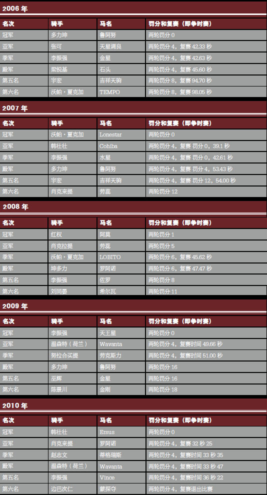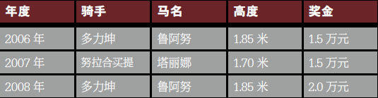 來(lái)自中國(guó)香港的騎手林子心在2011年的比賽中 北京西塢大獎(jiǎng)賽創(chuàng)立于2006年,至今已成功舉辦過(guò)六屆,是目前國(guó)內(nèi)馬術(shù)運(yùn)動(dòng)市場(chǎng)化運(yùn)作最高水平的經(jīng)典品牌賽事,也是全國(guó)性馬術(shù)比賽中最隆重的賽事活動(dòng),近年來(lái)逐漸受到國(guó)內(nèi)外馬術(shù)界的關(guān)注。 賽事項(xiàng)目設(shè)置有場(chǎng)地障礙賽和傳統(tǒng)障礙超高賽(亦叫能力超高賽),其中障礙超高賽紀(jì)錄已被中國(guó)馬術(shù)協(xié)會(huì)確認(rèn),成為中國(guó)紀(jì)錄。 大獎(jiǎng)賽于每年9月的第二個(gè)周末在北京西塢鄉(xiāng)村馬術(shù)俱樂(lè)部舉行,馬術(shù)場(chǎng)地障礙賽的要求是根據(jù)全國(guó)當(dāng)年積分排名進(jìn)行選定的;傳統(tǒng)障礙超高賽是全國(guó)開(kāi)放報(bào)名,報(bào)名者達(dá)到5人及以上才舉行該項(xiàng)比賽。 大獎(jiǎng)賽期間還舉辦與馬術(shù)運(yùn)動(dòng)相關(guān)產(chǎn)品展示、馬術(shù)運(yùn)動(dòng)推廣、與馬相關(guān)的藝術(shù)品展賣等活動(dòng)。比賽最后一天當(dāng)晚還舉辦慶祝晚宴,社會(huì)名流、商業(yè)精英、演藝明星、媒體人、外國(guó)友人、馬術(shù)愛(ài)好者歡聚一堂,回顧過(guò)去,暢想未來(lái)。 傳統(tǒng)大戲:障礙超高賽 傳統(tǒng)障礙超高賽是在最后進(jìn)行的一場(chǎng)賽事,因?yàn)殡y度大,受到關(guān)注也大。在6年的西塢大獎(jiǎng)賽中只舉辦過(guò)3次,未能按屆舉辦的主要原因是報(bào)名不夠5名或天氣及場(chǎng)地因素不允許。三屆比賽成績(jī)見(jiàn)表1,從表1可以看出,運(yùn)動(dòng)員多力坤無(wú)疑是中國(guó)場(chǎng)地超高賽跳得最高的選手,人們說(shuō):“多力坤的坐騎白青毛馬‘魯阿努’仿佛就是為‘能力超高賽’所生的。” 壓軸大戲:場(chǎng)地障礙賽 場(chǎng)地障礙賽是西塢大獎(jiǎng)賽的“壓軸”大戲,參賽運(yùn)動(dòng)員都是此項(xiàng)領(lǐng)域的高手,技術(shù)精湛,比賽精彩。六屆比賽的成績(jī)見(jiàn)表2,從表2中可以看出,在六屆比賽中,每屆的冠軍皆不同。 特殊戲份:西塢大獎(jiǎng)賽的其他亮點(diǎn) 除了場(chǎng)地障礙賽和能力超高賽之外,還有其他精彩之處值得一提。 (1)獎(jiǎng)金高:西塢大獎(jiǎng)賽在國(guó)內(nèi)馬術(shù)比賽中是最高的,自2006年開(kāi)始的總獎(jiǎng)金10萬(wàn)元,到2011年增長(zhǎng)到39.9萬(wàn)元,單場(chǎng)場(chǎng)地障礙賽2006年的獎(jiǎng)金是3萬(wàn)元,2008年為5萬(wàn)元,2011年為10萬(wàn)元。能力超高賽的獎(jiǎng)金最高時(shí)達(dá)2萬(wàn)元。 (2)設(shè)置冠軍馬飼養(yǎng)員獎(jiǎng):這個(gè)獎(jiǎng)項(xiàng)意在鼓勵(lì)飼養(yǎng)員把馬養(yǎng)好,是一個(gè)有意義的獎(jiǎng)項(xiàng)。在2010年這項(xiàng)獎(jiǎng)金為:場(chǎng)地障礙賽和能力超高賽冠軍馬的飼養(yǎng)員各2000元。獎(jiǎng)金不高,但意義深遠(yuǎn)。 (3)為冠軍贈(zèng)馬鞍:艾奇達(dá)馬具公司熱心支持馬術(shù)事業(yè),為每屆場(chǎng)地障礙賽冠軍贈(zèng)送馬鞍一盤。 (4)觀眾人數(shù)多:每次比賽都有大約2000名觀眾來(lái)現(xiàn)場(chǎng)觀看,創(chuàng)造除廣州亞運(yùn)會(huì)、濟(jì)南全運(yùn)會(huì)馬術(shù)比賽之外的人數(shù)最多紀(jì)錄。 (5)西塢晚宴:亦號(hào)稱“西塢千人晚宴”,宴會(huì)廳由馬術(shù)室內(nèi)大廳臨時(shí)改成,該晚宴具有獨(dú)特的特色,名人薈萃,集文藝活動(dòng)、公益拍賣成一體,成為西塢大獎(jiǎng)賽不可或缺的一個(gè)組成部分。 (6)運(yùn)動(dòng)馬獸醫(yī)基金:2011年共通過(guò)拍賣籌得運(yùn)動(dòng)馬獸醫(yī)基金71萬(wàn)元,用于為獸醫(yī)事業(yè)(包括教育培訓(xùn)、儀器設(shè)備改善等)提供公益資助。 (7)奧運(yùn)選手和國(guó)際選手參賽:西塢大獎(jiǎng)賽2011年的特色是有7名奧運(yùn)選手(其中4名中國(guó)奧運(yùn)選手)參賽,同時(shí)有來(lái)自國(guó)外(意大利、丹麥、德國(guó)等)及中國(guó)香港的運(yùn)動(dòng)員參賽。 (8)接力賽、馬主賽是西塢大獎(jiǎng)賽的特色項(xiàng)目。其中,馬主賽的目的是讓馬主有參賽的機(jī)會(huì),刺激和鼓勵(lì)馬主更加熱愛(ài)這項(xiàng)運(yùn)動(dòng)。 (9)名人解說(shuō):中央電視臺(tái)著名主持人蔡猛先生和著名音樂(lè)制作人巒樹(shù)先生的解說(shuō)是西塢大獎(jiǎng)賽的另一亮點(diǎn)。 名人談西塢大獎(jiǎng)賽 作為民間發(fā)起的、由企業(yè)的贊助馬術(shù)比賽項(xiàng)目,馬界名人的觀點(diǎn)值得我們思考。 馬界著名馬人、北京稻香湖馬術(shù)俱樂(lè)部總經(jīng)理王冀豫說(shuō):“西塢大獎(jiǎng)賽無(wú)疑是自下而上,群眾性體育運(yùn)動(dòng)落實(shí)在馬術(shù)運(yùn)動(dòng)上的結(jié)晶,表現(xiàn)了國(guó)際馬術(shù)運(yùn)動(dòng)的共性,如騎手、馬主、贊助商的鐵三角關(guān)系及俱樂(lè)部聯(lián)盟的形式.....。賽事促成中國(guó)馬術(shù)協(xié)會(huì)走出體制,恢復(fù)以服務(wù)于推動(dòng)馬術(shù)運(yùn)動(dòng)健康發(fā)展為使命的應(yīng)有作用。簡(jiǎn)言之:本賽事集約和調(diào)動(dòng)了馬術(shù)界的積極因素,開(kāi)始啟動(dòng)原動(dòng)力,并盡可能的將消極因素轉(zhuǎn)變?yōu)榉e極因素,有化腐朽為神奇的功效,摸索出一條中國(guó)特色馬術(s