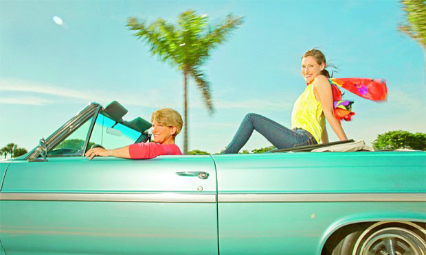 Jessica Springsteen和Beezie Madden坐在1964年出產(chǎn)的別克云雀轎車(chē)中,她們那種漫不經(jīng)心的感覺(jué)讓人不禁聯(lián)想起Thelma and Louise(一部美國(guó)電影),通常怕上鏡的Beezie此時(shí)看起來(lái)也很放松。在惠靈頓舉辦的FTI冬季馬術(shù)節(jié)剛過(guò),她們就來(lái)到弗羅里達(dá)州進(jìn)行“激勵(lì)”的拍攝。傍晚的余暉點(diǎn)燃了攝影師Liz Gregg的拍攝靈感,她想為兩位騎手設(shè)計(jì)出一種耳目一新、富有感召力的造型。為了拍攝飛馳轎車(chē)的上半部分,Liz半躺半蹲地坐在同樣飛快移動(dòng)的高爾夫球車(chē)?yán)铮M管Liz姿勢(shì)糾結(jié),但是所拍的這張照片卻表現(xiàn)出了積極樂(lè)觀(guān)、獨(dú)立向上女性的形象——清澈的藍(lán)天下,兩位騎手坐在車(chē)中共同分享著陽(yáng)光沐浴的一刻。