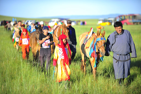 黑馬指的是黑色的馬,同時在體育報道中指的是爆冷門取得好成績的人或馬。阿布嘎黑馬是指一個馬品種,是生長在錫盟阿布嘎草原上黑色的馬,阿布嘎女子黑馬連在60年代曾受到過周恩來總理的高度贊揚(yáng).在這次大賽馬中,來自阿布嘎的馬成為了比賽中的“黑馬”,顛覆了整個內(nèi)蒙古草原。 盛夏時節(jié),初入草原,便感受到了“天似穹廬,籠罩四野”的大景象,覺得這首歌謠說的純粹是天和地的關(guān)系,這和人是沒有關(guān)系的,人到草原,就像一滴水融入大海,人太渺小了。 我們驅(qū)車奔馳在遼闊的錫林郭勒盟大草原上,目的地是西烏珠穆沁旗的政府所在地巴拉嘠爾高勒鎮(zhèn),那里將舉辦一年一度的傳統(tǒng)草原大賽馬(30.5公里耐力賽)。我們電視團(tuán)隊五人小分隊,先行進(jìn)入草原,采訪即將參加比賽的各地馬主、選手。我坐在前排副駕的位置上,視野相對開闊,無際的草原上幾百公里幾乎沒有參照物,我有時會感覺是坐在一種模擬的駕駛艙中,原地不動,草原從兩邊劃過。我想,在這樣遙遠(yuǎn)無邊的空間里,人是無法靠兩腳去走的。偉大的自然賜予了人一種相互聯(lián)系的精靈,那就是馬。在草原上,馬雖然軀體和人一樣渺小,但馬有速度,馬的速度縮小了草原的空間,打破了草原的局限性,人便真正擁有了草原。 錫林郭勒是漢語音譯,意思就是美麗的河,我們在錫林河畔采訪馬術(shù)俱樂部的江樹軍先生,采訪調(diào)馬師巴特,因?yàn)榻壬桶吞乩蠋熯B夜去草原接小騎手迷了路,誤了點(diǎn),我們是起了個大早,卻干了個晚集。早晨7點(diǎn)多鐘的時候,太陽的光芒很強(qiáng)烈,有內(nèi)地中午11點(diǎn)鐘的感覺。在監(jiān)視器上看,馬背上鑲嵌了一層刺眼的藍(lán)光,我忽然覺得有點(diǎn)莊周夢蝶的味道。雖然腳上的皮鞋都被露草濕透了,可采到了江先生,巴特老師的真言也值得。他們說:蒙古馬和其它混血馬的區(qū)別是,蒙古馬耐力好,中、短距離速度稍慢于其它改良馬。我們問那為啥還選擇蒙古馬參賽,他們說蒙古馬是蒙古族文化的一部分,蒙古馬長久奔跑的耐力好,越長距離就越顯優(yōu)勢,再說也是蒙族人精神的象征。蒙古馬在草原的生存能力極強(qiáng),當(dāng)草原變成茫茫雪原時,懷著身孕的蒙古馬,領(lǐng)著小馬駒,刨開積雪吃枯草養(yǎng)育后代。帶著蒙古馬去參加比賽,就是為了傳承這種文化,名利倒在其次,但也絕對差不了。 西烏珠穆沁旗簡稱西烏旗,“烏珠穆沁”意思是“摘葡萄者”,他們是從長葡萄的新疆那邊來的。這里的草原是世界四大草原之一錫林郭勒草原的典型區(qū)域和蒙古馬的核心區(qū),風(fēng)光旖旎,蒙古族文化習(xí)俗保存的十分完整。我們趕到鎮(zhèn)里,看到不少人傳蒙古袍,街道很多馬匹穿來穿去。 在30.5公里的賽道上布置了25個固定機(jī)位。我們是雨中進(jìn)入草原賽道的,今年雨水足,草原水草豐茂。有的地方的草快長到人的腰部,草原因?yàn)橛胁萜じ采w,沒有水土流失,所以很少溝坎,但草原并不是平坦的,有山包,有坡地,就像大海一樣,遠(yuǎn)看平展,近看波濤起伏。 2010年7月17日凌晨4點(diǎn)鐘,我們和大部隊趕到賽道起點(diǎn),這里在小鎮(zhèn)的西南方向,在特別遼闊的成吉思汗瞭望山下,賽道基本為東南方向,臨近終點(diǎn)時向主會場沖刺。馬主門昨夜已開上輕型卡車在這里夜宿。太陽升的很快,草地上濕漉漉的,夜里露水很重,我很高興,希望馬奔跑時減少塵土。草原上有名的馬主、調(diào)馬師們,象呼倫貝爾的芒來(首屆冠軍),通遼市的松林(近兩屆冠軍),二連浩特的包昌(蒙古國賽馬冠軍)等在參賽馬中走來走去,裝作不經(jīng)意的樣子,可眼光又在馬身上飄來飄去,他們在看對手馬的狀態(tài),好馬能不能跑好,關(guān)鍵在昨天夜里,比如夜草吃的合不合適。這就是兵法上說的知己知彼,百戰(zhàn)不殆。西烏旗連續(xù)舉辦了好幾屆賽馬,只是上屆才得上名次,這次渴望更上一層樓,參賽的蒙古馬調(diào)的不錯,毛色發(fā)亮,肌肉發(fā)達(dá),胸肋突出無贅肉,還找了個老騎手,小矮人。通遼市的馬主松林是近年的冠軍得主,他的馬是半血馬,已經(jīng)連續(xù)兩屆了,這次再奪冠就是三連冠了,不過他去年的冠軍馬,已轉(zhuǎn)手賣給了他人,也報名參加了今天的比賽,只是到現(xiàn)在馬上就要比賽了還不見冠軍馬的蹤影。松林預(yù)測今年報名馬雖少但好馬多于往年,比賽會更加激烈。 在賽道起點(diǎn)的排列中,有一位中年女選手引起了我們的注意,采訪中她笑著說,要是拿了冠軍,就再買匹馬。來自西烏旗的扎寶力格說,昨天黃昏時分,他們還穿上民族服裝,為賽馬舉行了香薰儀式,祈求好的成績,保佑騎手和馬兒的平安。 太陽從一個山包后升起,陽光充滿力量的照射在草原上,無際的青草更加滴翠。70多匹賽馬一字排開,上一屆的冠軍馬還是沒有來。 發(fā)令槍響!1號馬率先沖出,馬群隨后跟上,往東南方向飛馳而去。小飛機(jī)俯沖航拍,驚了一匹馬,選手從馬背上掉下來,剛才有決心奪冠的女選手,剛跑了一公里,就掉隊了。我坐上導(dǎo)演車,也向終點(diǎn)追去,路上看到了沒有騎手的馬,依然頑強(qiáng)的向前跑著。比賽開始,速度達(dá)到每小時50公里左右,轉(zhuǎn)眼就拉開了一條線,五公里處已分出三個集團(tuán)。 有幾匹來自阿旗的純蒙古馬和眾多半血馬混在一起,樣子雖不如其它馬好看,但跑起來卻十分