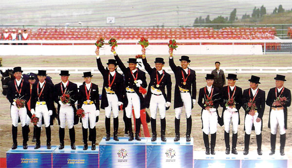 全運會馬術(shù)比賽設(shè)置與奧運會稍有不同,奧運會中的一塊三項賽個人金牌在全運會上改成了12000米速度賽馬金牌,但均設(shè)六塊金牌。在第十一屆全運會上,廣東隊奪得兩枚金牌,獨占鰲頭,新疆隊、上海隊、湖北隊、香港隊各摘得一枚金牌。 首塊金牌:盛裝舞步團體 戲劇性場面出現(xiàn)在產(chǎn)生金牌前最后一個出場的運動員,他就是全國錦標(biāo)賽冠軍廣東選手顧兵。他的表演決定廣東奪冠還是新疆奪冠,只要他穩(wěn)定發(fā)揮,廣東的冠軍就會到手。前八個動作都十分順利,突然一陣狂風(fēng)卷入賽場,一個紅色花盆隨風(fēng)刮到馬的蹄前,瞬間場地一半擋板也隨風(fēng)倒下。此時,場外的觀眾都為顧兵擔(dān)心和惋惜,我也感覺顧兵不太走運,人馬一亂肯定失金??纱藭r的顧兵如入無人之境,依舊做著動作。這時工作人員到場內(nèi)告知,比賽暫停。隨后,顧兵掉轉(zhuǎn)馬頭在場邊依舊做動作。鈴聲響起,裁判決定從第九個動作重新開始,顧兵十分穩(wěn)健地開始了比賽,結(jié)果他以出色的表演使廣東超出新疆2分多,從而贏得了這枚金牌。丹麥籍教練約翰十分感慨,對顧兵臨危不亂的鎮(zhèn)定給予極高的贊揚。 第二塊金牌:盛裝舞步個人 痛失團體金牌的新疆隊,已沒有退路。北京奧運會唯一的馬術(shù)女騎手劉麗娜開始向金牌沖擊,她必須拿出奧運騎手的勇氣,她成功了。新疆體育局黨組書記李光明說:“劉麗娜是能打硬仗的新疆姑娘?!辟惡?,廣東教練白捷勇評論說:“劉麗娜表現(xiàn)固然好,但顧兵的策略不對,他太求穩(wěn)了。在團體中求穩(wěn)成功了,但今天如果更放開些,也同樣有可能沖金。” 第三塊金牌:三項賽團體 經(jīng)過前兩天的盛裝舞步團體和個人比賽之后,第三天三項賽團體比賽的局面更為嚴(yán)峻。暫排在第一名的廣東隊僅與第二名的上海隊差10分;第三名的山東隊與第四名的江蘇隊差8分,這就意味著第三天的場地障礙賽無論哪個隊多打掉兩、三根桿,就會失去金牌和獎牌。結(jié)果,之前暫排在第二名的上海隊在最后一項場地障礙上演了大翻盤,最終獲得金牌。廣東隊獲得銀牌、山東隊獲得銅牌。特別值得提的是,山東隊第一次參加全國馬術(shù)大賽就拿到了銅牌,可以說是創(chuàng)造了一個奇跡。 第四塊金牌:場地障礙賽團體 廣東、香港、上海第一輪后排在前三名,廣東三人只罰4分,香港和上海各罰12分。第二輪比賽,香港隊發(fā)揮失常,上海隊最后出場的張濱打掉了一桿,使得廣東隊最后獲得冠軍。 第五塊金牌:場地障礙賽個人 香港隊在2008年奧運會上有非常出色的表現(xiàn),但這次全運會由于檢疫的原因,只能臨時從歐洲購買百萬元左右的馬運入中國,所以人馬配合上自然不夠穩(wěn)定。團體比賽首輪罰零分的林子心,一不小心從場地東側(cè)圍欄跳出了場外,引得在場觀眾哈哈大笑。定神一看,圍欄確實很像一道障礙,可能是選手稍一走神兒,就把圍欄當(dāng)成了障礙。據(jù)說出現(xiàn)這種情況,即使在歐美也是罕見的,這也成了馬術(shù)界的永久花絮。香港隊的選手的確是技高一籌,林立信以兩輪罰零分的絕對優(yōu)勢奪得冠軍,而來自廣東的李振強兩輪罰4分名列第二。 第六塊金牌:速度賽馬(12000米) 速度賽馬和上屆全運會一樣仍為12000米距離,比賽形成一邊倒的形勢,代表湖北隊的北京馬主郭進訓(xùn)練的三匹馬,成為了關(guān)注的焦點。匯海精英和匯海大圣以15分34秒和15分54秒的成績分獲冠、亞軍,而金銀莊主(六歲扇馬)因沖刺時彎道換腿蹬空,造成右前腿骨折,按照國際慣例實行了安樂死,引起熱議并成為焦點。湖北奪得速度賽馬金、銀牌很好理解,這是因為北京馬主郭進的馬代表湖北參賽,這種做法符合全運會相關(guān)規(guī)定。而死馬一事就相對復(fù)雜,可以聽聽不同的聲音。 通過本屆全運會的速度賽,我們發(fā)現(xiàn)了其中的一些提高與不足之處。 為了確保賽馬的安全,競委會采取了多項措施: 1、對馬匹健康的檢驗檢測進行了嚴(yán)格把關(guān)。本次全運會,有國際獸醫(yī)以及香港賽馬會的相關(guān)人士組成的驗馬評審團,如果發(fā)現(xiàn)參賽馬匹有跛行、瘸腿等情況,將在待檢區(qū)等待接受復(fù)檢,如果復(fù)檢不合格,賽馬就必須退出比賽。而在檢測過程中,最初待參賽馬匹有77匹,后來縮減為40匹。又經(jīng)過層層檢測,包括香港和澳門相關(guān)部門出示的馬匹退役證明,以及臨近比賽前因為身體健康狀況被淘汰的9匹馬,最后出現(xiàn)在全運會速度賽賽場上的馬匹數(shù)量為19匹。 2、按照國際馬術(shù)協(xié)會“馬的利益高于一切”的原則,任何情況下,騎乘人應(yīng)當(dāng)善待馬匹,愛護馬具及俱樂部設(shè)施,絕對禁止虐待和傷害馬匹的行為。否則,騎乘人將被取消騎乘資格,并對因其行為造成的馬匹受損害承擔(dān)賠償責(zé)任。在今年全運會上,各支參賽隊的愛馬意識越來越高。從對馬匹的愛護,到按規(guī)則進行馬匹的檢驗檢疫,以及比賽過程中寧可犧牲成績也要保護馬匹的安全,這樣在保護了馬匹同時,馬主的利益也得到了保障。為了確保賽馬的安全,競委會采取了多項措施,譬如比賽中途設(shè)立多個監(jiān)控點,裁判一旦發(fā)現(xiàn)賽馬有過度疲勞或受傷的跡象,有權(quán)立即示意騎手停止比賽,并協(xié)調(diào)專業(yè)救護人員對賽馬進行緊急處理。而在比賽終點
