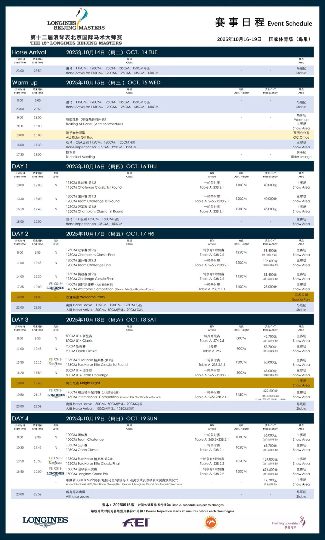 金秋十月,馭夢歸來,躍見傳奇 10月16日至19日 世界的目光將再次聚焦國家體育場(鳥巢) 第十二屆浪琴表北京國際馬術大師賽蓄勢待發(fā) 來自歐洲、美洲、亞洲的頂級騎手匯聚于此 與中國精英與新生代并肩競躍 優(yōu)雅與速度共舞,精準與力量輝映 一場匯聚全球焦點的馬術盛典,即將點燃! 自2011年首度落地鳥巢 浪琴表北京國際馬術大師賽迎來全新篇章 這里,是中國騎手與世界同場競技的殿堂 也是觀眾近距離領略國際水準的盛會 十二屆賽事耕耘,超百位世界冠頂尖騎手曾馳騁鳥巢,他們共斬獲17枚奧運金牌。超過1,700名中國騎手登上這方舞臺,觀眾總計突破36萬人次。 歷經(jīng)沉淀與蛻變,浪琴表北京國際馬術大師賽早已超越競技本身,它見證了中國馬術的成長,也讓世界看到了我們的舞臺。今日再啟,傳奇即將躍升新章! 今年大賽總獎金 204萬元人民幣,12位國際頂尖騎手強勢集結,其中4位曾登頂世界第一。 世界馬術王者亨里克·馮·艾克曼(Henrik von Eckermann)、荷蘭名將哈里·斯莫爾德斯(Harrie Smolders)、德國戰(zhàn)車丹尼爾·杜瑟(Daniel Deusser)以及比利時傳奇雙子星代表奧利維爾·費利佩爾茨(Olivier Philippaerts)與格雷戈里·瓦泰萊(Gregory Wathelet)等悉數(shù)到場。 中國陣容同樣星光熠熠,奧運騎手李耀鋒、張興嘉,亞運新銳陳雨辰領銜出戰(zhàn),兩屆浪琴表大獎賽冠軍梁銳基等再度沖擊巔峰。 他們將代表中國,與世界最強陣容同場較量,在鳥巢書寫新的榮耀時刻。 10月16日|開幕日 團體賽燃情揭幕,年輕騎手率先登場 10月17日|決戰(zhàn)日 125CM冠軍賽與120CM團體賽強勢對抗 10月18日|狂歡日 青少年賽、EuroHorse精英賽閃耀上演 夜幕下「騎士之夜」盛典開啟 10月19日|巔峰日 壓軸登場——135CMEuroHorse決賽 與150CM浪琴表大獎賽 巔峰對決,終定桂冠之主! 四天賽程、場場焦點 每一次躍起,都將是世界頂尖的較量 文末留下你最期待的騎手名字 截至10月17日晚18:00 點贊最高的前8名 我們將送出18日/19日 【馬術雜志嘉賓·專屬觀賽邀請函】 賽事期間,鳥巢將化身一座充滿活力的馬術生活空間 三大票區(qū),帶給你沉浸式觀賽體驗 1 VIP坐席 尊享五星級餐飲、專屬伴手禮、核心高端禮遇 2 內場坐席 近距離感受主賽場與熱身區(qū)雙重氛圍 3 看臺坐席 一覽全景,捕捉每一次完美躍越 這里匯聚運動、美食與生活方式 浪琴表以現(xiàn)代工藝詮釋經(jīng)典 展示功能與美學的合二為一 詮釋時空聯(lián)結的永恒詩意 保時捷展區(qū)詮釋馳騁精神 CT、CWD、EQUILINE、八尺龍、瑪尚、忻駿 小馬百寶屋展示人馬合一的優(yōu)雅 瑰麗酒店攜手桑干、西鳳酒、voss 戰(zhàn)馬、德京咖啡呈獻秋日臻味 SIGMA相機定格優(yōu)雅瞬間 鳥巢文創(chuàng)點亮紀念時刻 更有親子互動、小馬體驗、簽名合影與驚喜抽獎 吉祥物星仔、星妹帶來歡樂陪伴 讓馬術精神延展為全家共享的生活美學 十二載征程,即將再啟新篇 10月16日至19日,讓我們相約鳥巢 共賞人馬合一的極致時刻 見證傳奇再躍、榮耀重燃 一起「躍見傳奇 Mastery in Motion」! “圖片來源于浪琴表北京國際馬術大師賽官方及網(wǎng)絡” 文末留下你最期待的騎手名字 截至10月17日晚18:00 點贊最高的前8名 我們將送出18日/19日 【馬術雜志嘉賓·專屬觀賽邀請函】 |