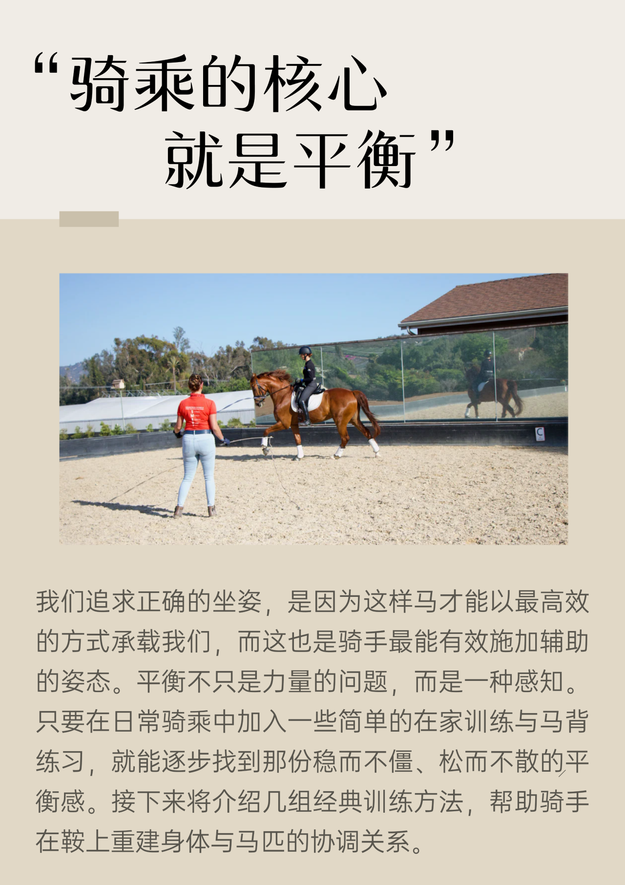 學(xué)習(xí)如何在騎乘中改善平衡,是成為一名高效騎手的基礎(chǔ)。無論是在復(fù)雜的障礙賽場上追求高度與精準(zhǔn)、在盛裝舞步中追求優(yōu)雅動作,還是只是享受一段輕松的林間騎行,騎手能否保持身體居中、穩(wěn)定、與馬匹相連,是實(shí)現(xiàn)人與馬溝通的關(guān)鍵。 然而,真正的平衡并非一蹴而就,即使對經(jīng)驗(yàn)豐富的騎手來說,這也是一個持續(xù)探索的過程。 平衡訓(xùn)練的核心,不是追求某個標(biāo)準(zhǔn)姿態(tài),而是培養(yǎng)“感知力”。當(dāng)騎手學(xué)會通過核心去穩(wěn)定、通過腿去引導(dǎo)、通過騎坐去溝通,馬匹也會在你的身體信號中獲得安全感與方向感。 |