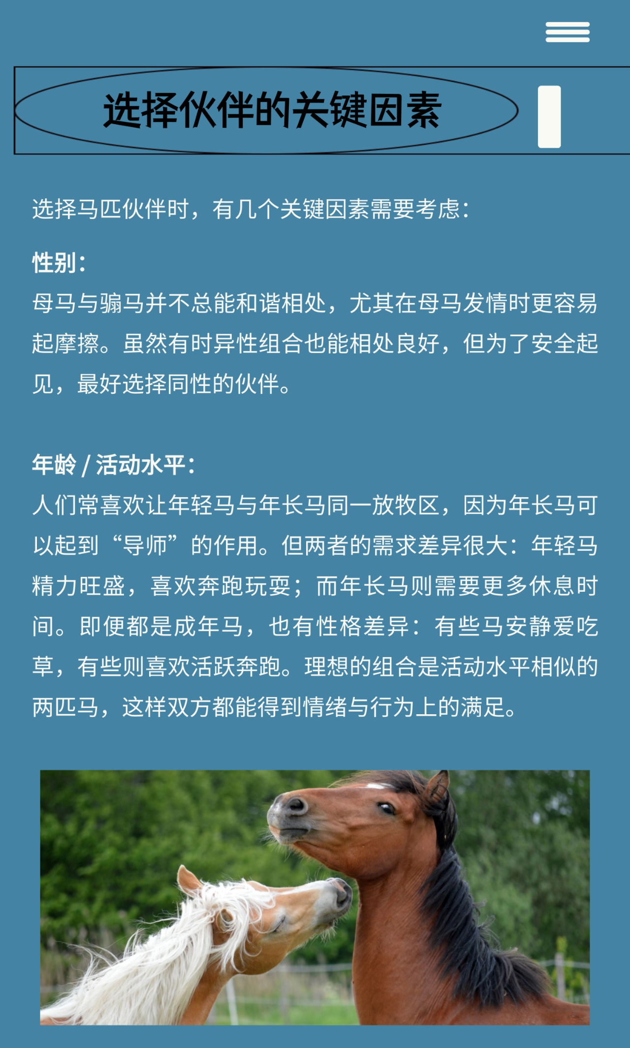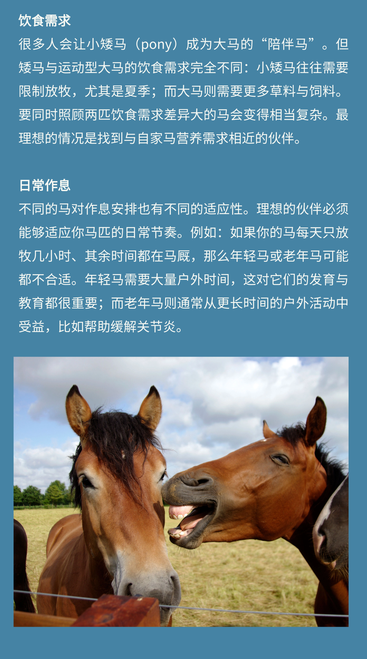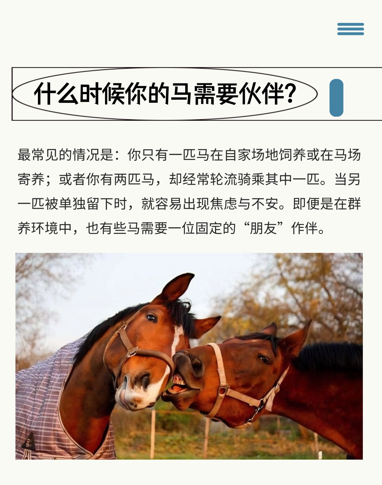 如果無法滿足其社交需求,馬的壓力水平會顯著上升,表現(xiàn)出緊張、易驚甚至“頑皮”的行為。然而,雖然你的馬需要朋友,但并不是任何一匹馬或動物都能成為理想的伙伴。要找到合適的“馬友”,你需要仔細思考。