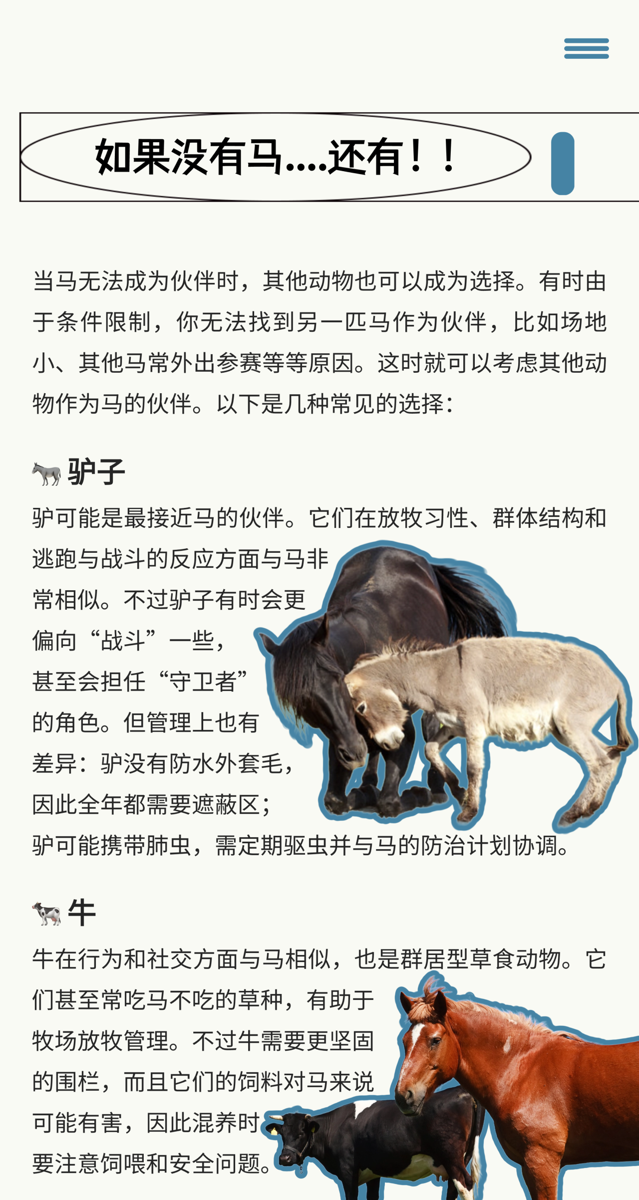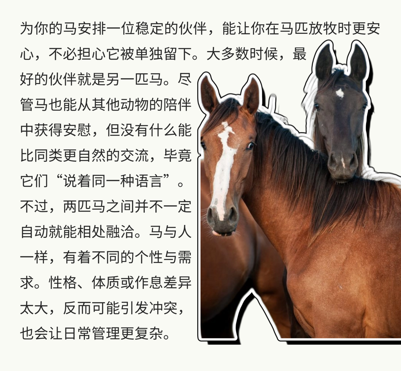 為馬選擇伙伴看似簡單,實則需要很多的考量。理想的搭檔不僅能讓你的馬情緒更穩(wěn)定、生活更快樂,還能讓日常管理更輕松。無論你選擇另一匹馬、還是其他動物,只要理解并尊重它們各自的天性,讓它們安全、舒適、被陪伴,就是最好的選擇。